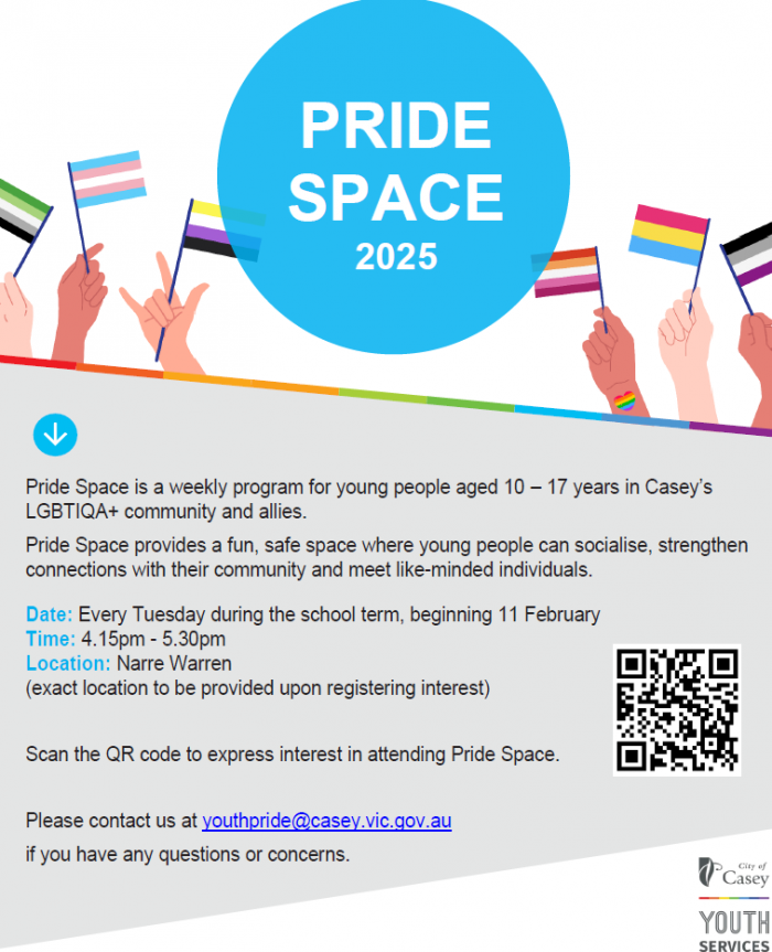 Pride Space provides a fun, safe space where young people can socialise, strengthen connections with their community and meet like-minded individuals. Sessions run every Tuesday in person during the school term from 4:15pm – 5:30pm in Narre Warren.