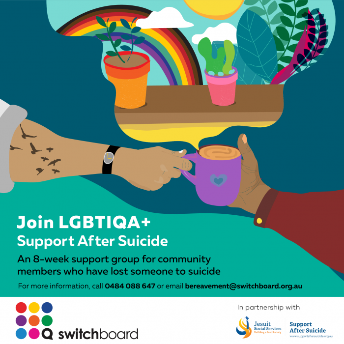 • spending time and experiencing peer connections with other LGBTIQA+ people who are going through suicide loss