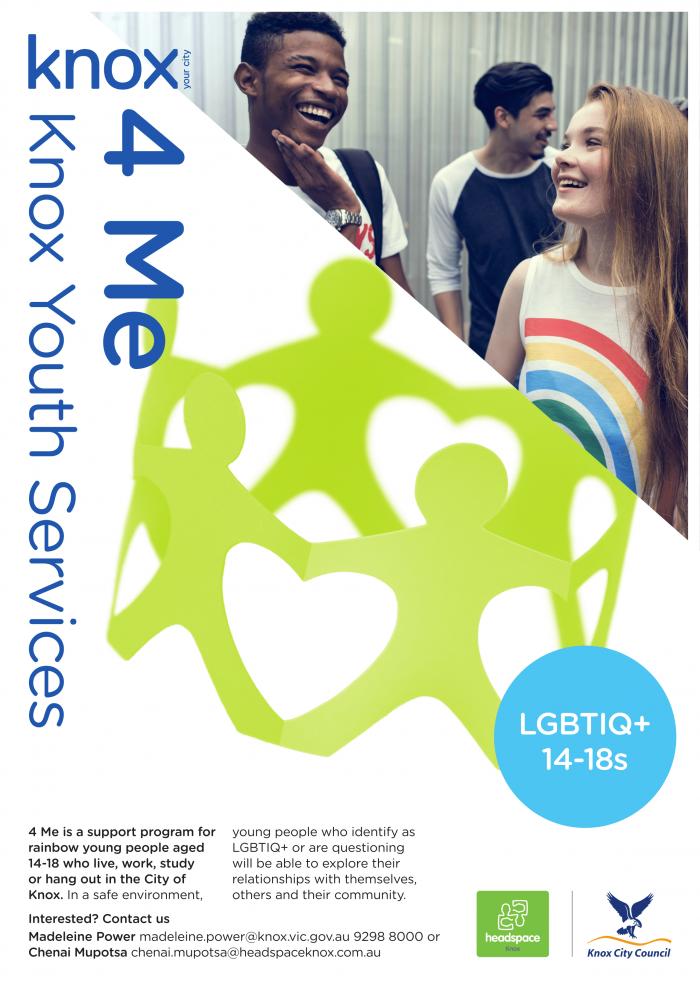 4 Me is a support program for rainbow young people aged 14 - 18 who live, work, study or hang out in the City of Knox. In a safe environment, young people who identify as LGBTIQ+ or are questioning will be able to explore their relationships with themselves, others and their community.